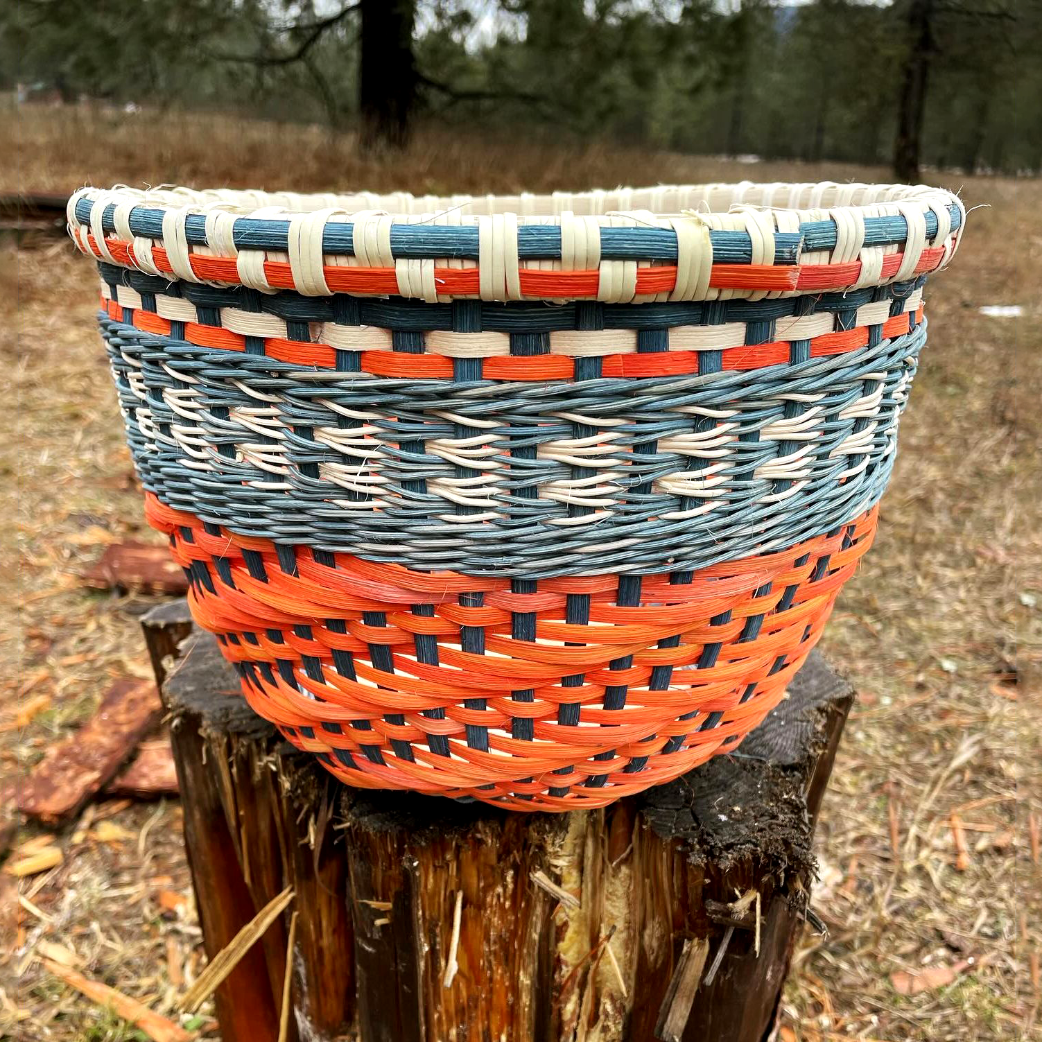 Our version starts with a wooden base and a Fibonacci continuous weave. Just to turn the temperature up we crowned it with a turkey trot weave and finished it off with a super easy rim embellishment.