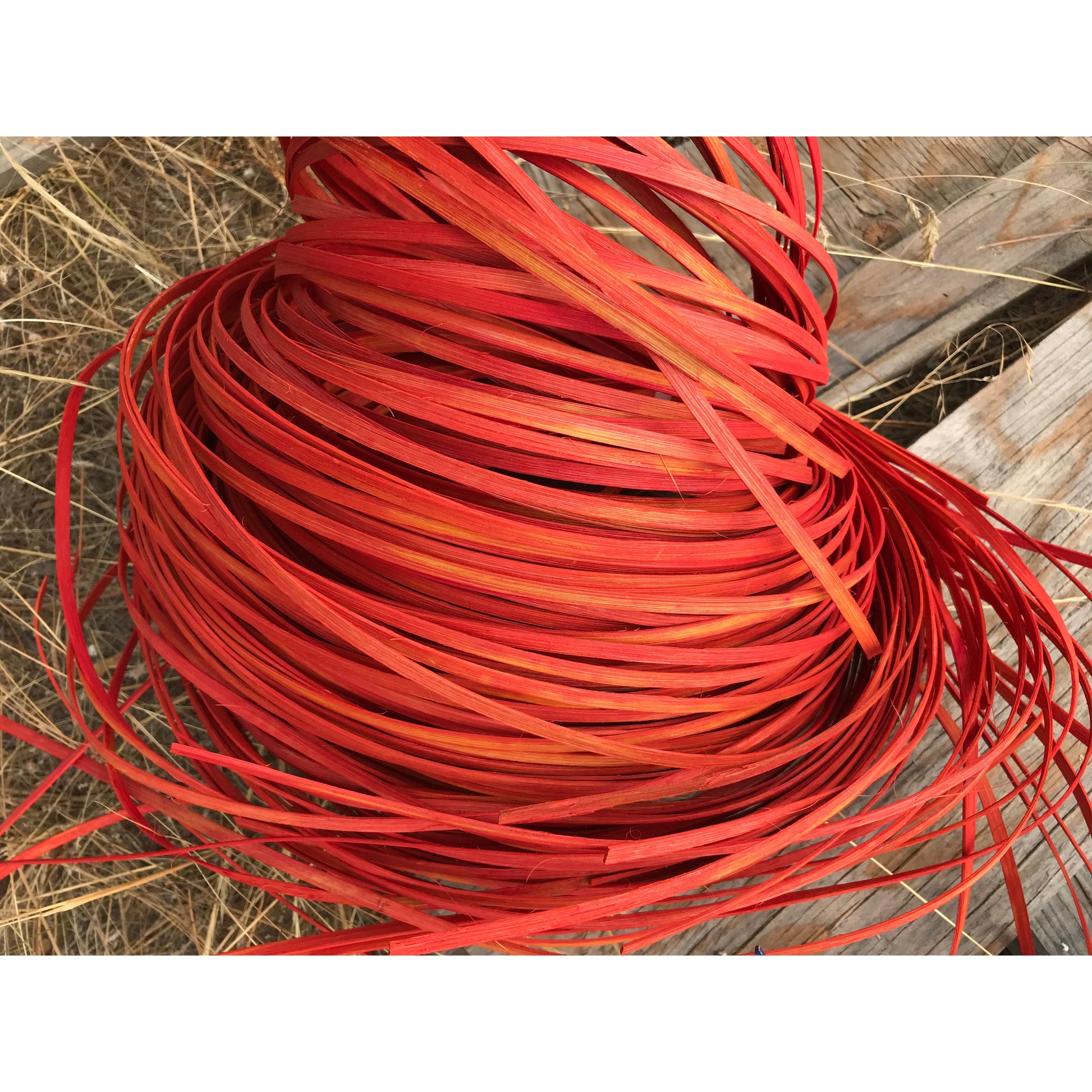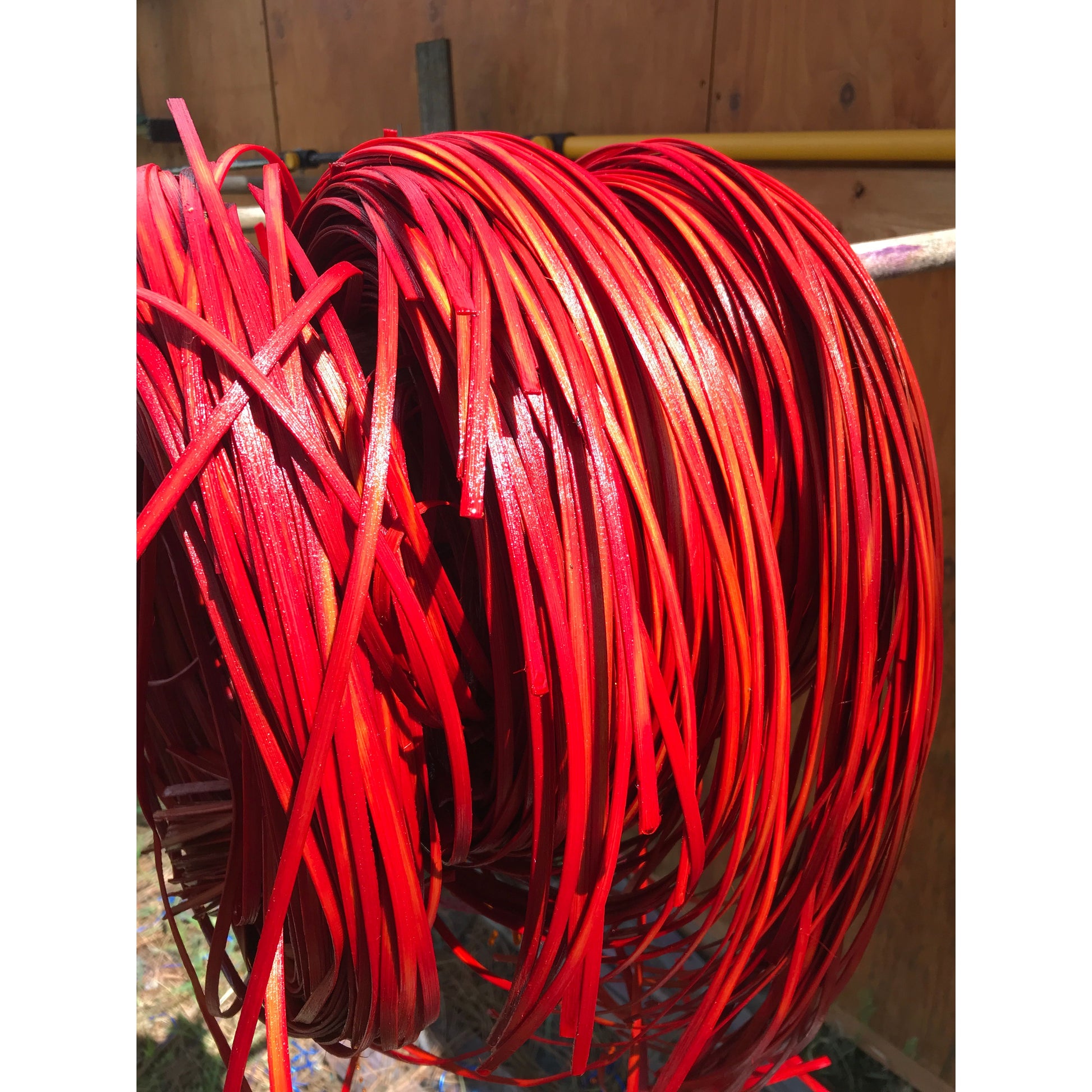 Dye season is underway, with a limited run of twelve coils per size of this Fire Tie-Dyed Reed. Each batch is dyed to order. Spring weather can be unpredictable, so occasional delays may occur.